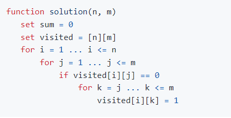 for k =j .... k<=m : 여기가 관건입니다. j가 1일때, 모든 visited[i][k]는 1로 만들것입니다. 즉 j가 2이상 m이하일때 k-for문은 작동하지 않으며, 다음 i값으로 넘어가야만 k-for문이 실행될것입니다. 즉 k-for문은 j가 1일때에만 동작합니다. 그 시간 복잡도는 O(M)이 되는것입니다. 그 외 k - for문은 j가 1일때에만 동작합니다. O(1)이 걸린다는 소리입니다.