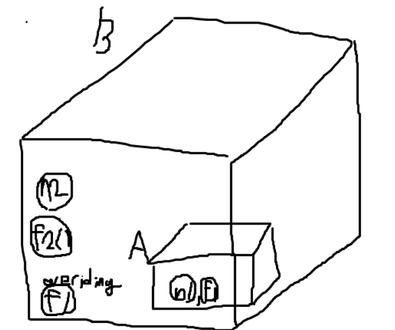실행 시점에서 A의 f1이 아닌 B의 f1을 출력함. [동적바인딩]