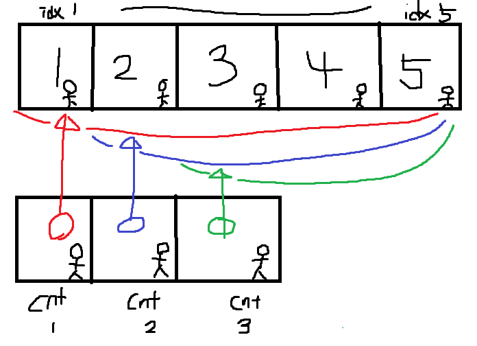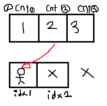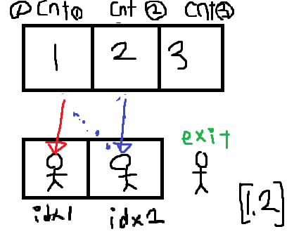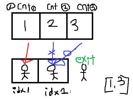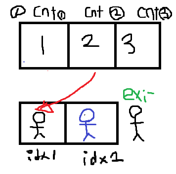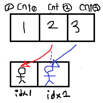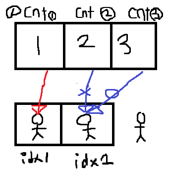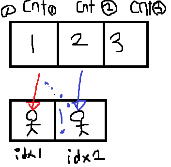//idx는 졸라맨이 cnt가 만들어준 값을 갖고있는것에대한 인덱스, cnt는 졸라맨이 갖고와야하는값에대한 인덱스입니다.