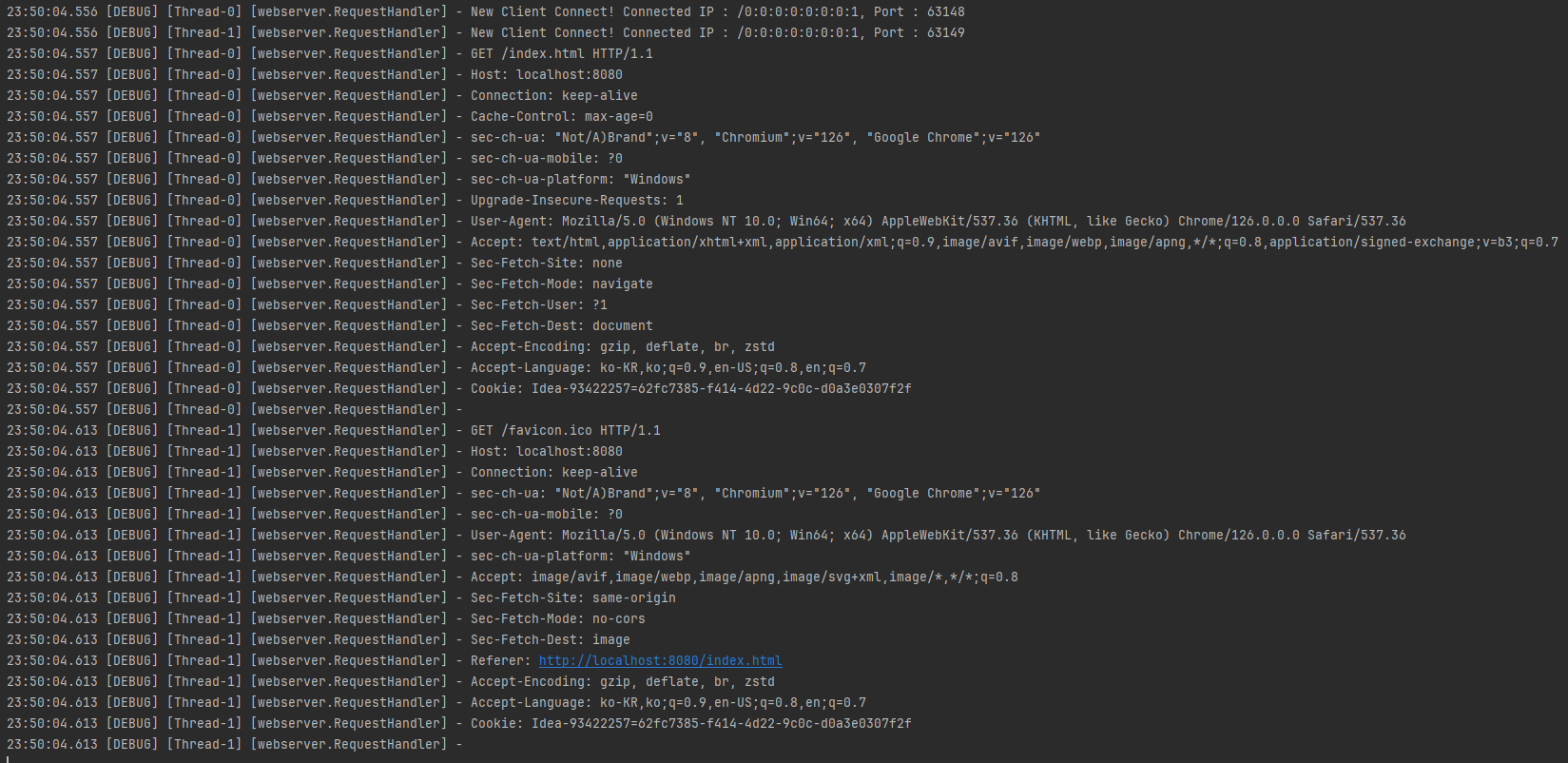 favicon.ico문제를 제치니 정상적으로 문제가 해결되면서 1단계를 완료하였습니다. 우리는 이를 통해 Client의 요청으로 인해서 HTTP Header가 InputStream 객체에 담겨져있고 사용자의 HTTP Header를 손쉽게 출력할수 있었습니다. HTTP Header를 어떻게 출력하고 다룰수있었던건지 아는 기회를 받았습니다.