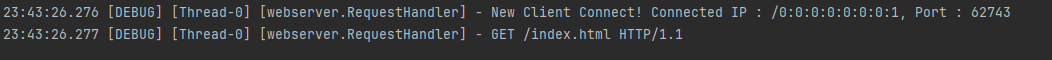 HTTP Header를 읽을수있었고, InputStream, OutputStream의 특징을 알아내었습니다. 또한 split를 사용하여 URL을 얻을수있었지만 split보단 substring이 성능이 더 좋다고 생각합니다. 이 부분이 아쉬웠지만 나중을 통해서 해결해보겠습니다. 또한 byte배열로 index.html의 정보를 얻어내고 client 화면상에서 정보를 보여줄수있는 뿌듯함을 얻어낸것 같았습니다.