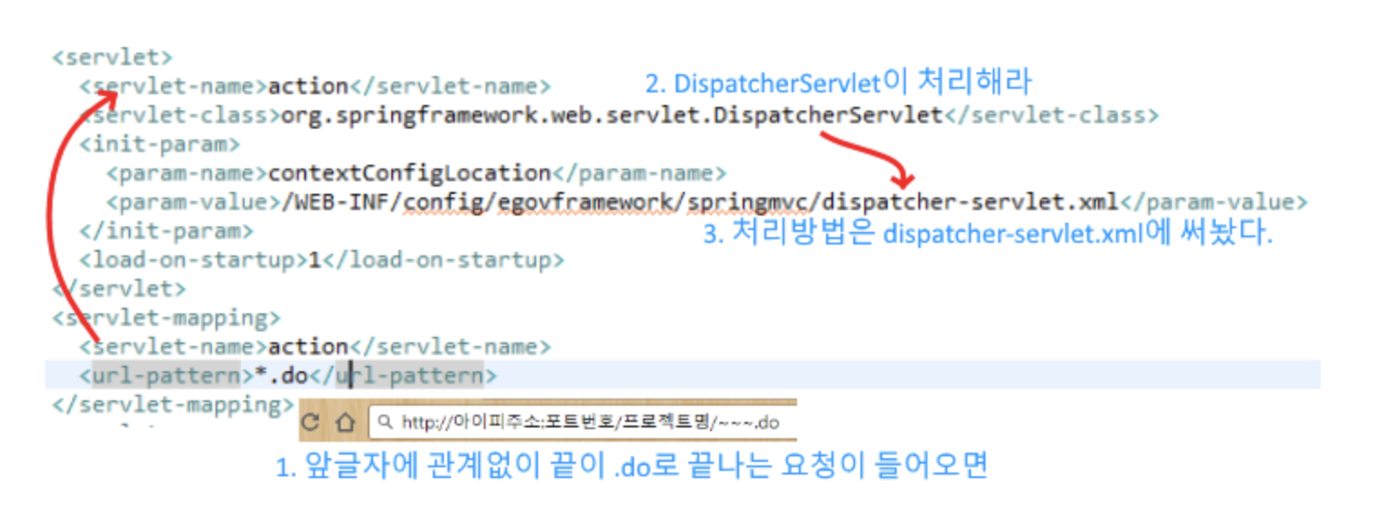 위의 <url-pattern> 안에 있는대로 .do가 붙어야 합니다. 'http://localhost8080/post/view.do'처럼 지정한 패턴이 web.xml에 들어있는 경우, DispatcherServlet은 요청을 가로채게 됩니다. 좀 더 자세히 말씀드리자면 그림으로 보여드리겠습니다.