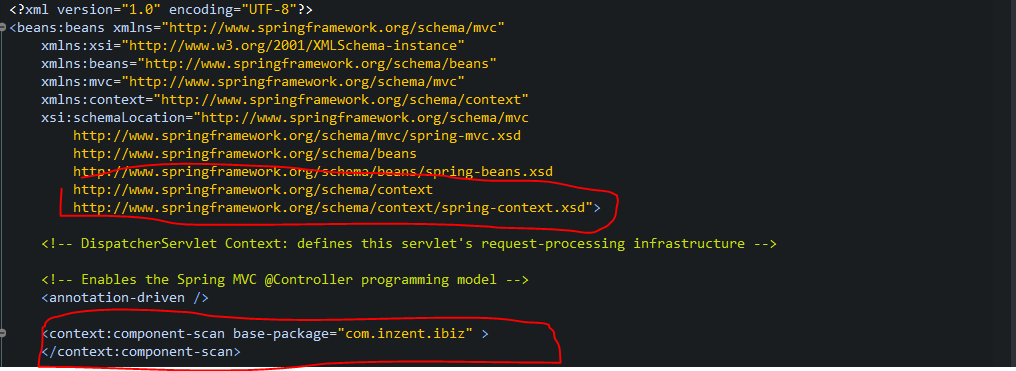 dispatcherservlet은 요청을 가로채서 web.xml이 설정한 토대로 흘러가게 됩니다. dispatcherservlet이 context와 함께 component-scan으로 설정했다면 com.inzent.ibiz 파일 내에있는 루트로 HandlerMapping이 감지하게 될것입니다.
