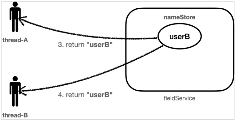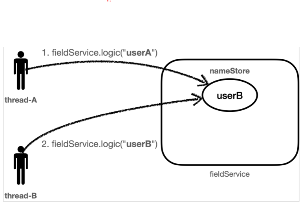 - FieldLogTrace는 싱글톤으로 등록된 스프링 빈이다. 이 객체의 인스턴스가 어플리케이션에 딱 하나만 존재한다는것이다.이렇게 하나만 있는 인스턴스의 FieldLogTrace의 traceIdHolder 필드를 여러 쓰레드가 동시에 한번 접근한다면 어떨까?