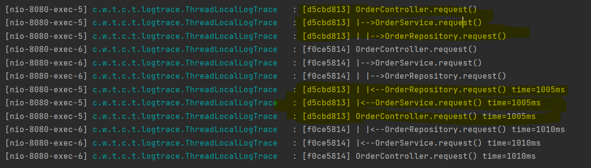 오른쪽은 동시성 이슈를 해결하였다. [d5cbd813] 이라는 traceId가 실행한 다음 [f0ce5814]도 똑같이 실행되지만 각기 다른 Thread에서 실행이 되고있다는걸 순차적으로 보여주고있다.