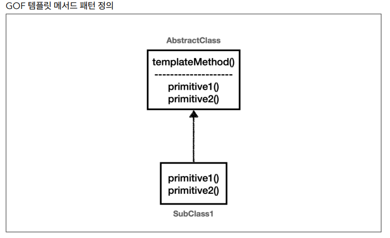 "작업에서 알고리즘의 골격을 정의하고 일부 단계를 하위 클래스로 연기한다. 템플릿 메서드를 사용하면 하위 클래스가 알고리즘의 구조를 변경하지 않고도 알고리즘의 특정 단계를 재정의할수있다"