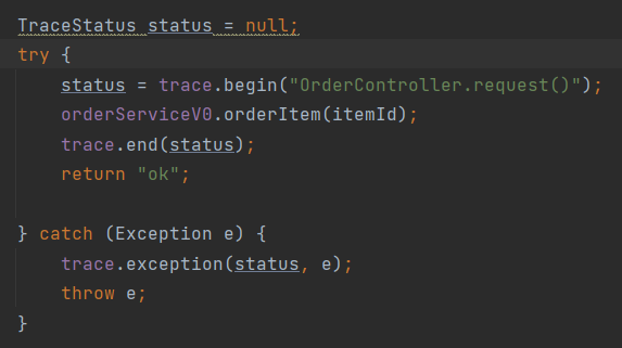 하지만 try-catch는 물론이고 핵심기능이 중간에 존재하여 단순하게 메서드 추출은 불가능하다.