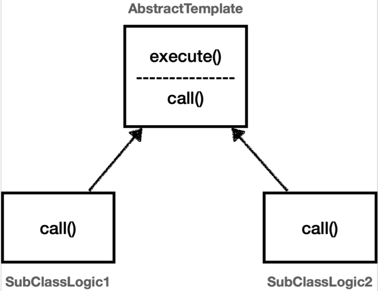 부모 클래스(AbstractTemplate)는 변하지않는 템플릿 코드를 가지고있고, 변하는 부분은 자식 클래스(implements 하고있는 클래스)에 두고 상속과 오버라이딩을 사용해서 처리한다.