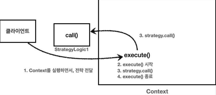 4. strategy.call() 을 실행 ( 이때 변하지 않는 구문에서 변하는 알고리즘을 채택하여 실행시킨다)
